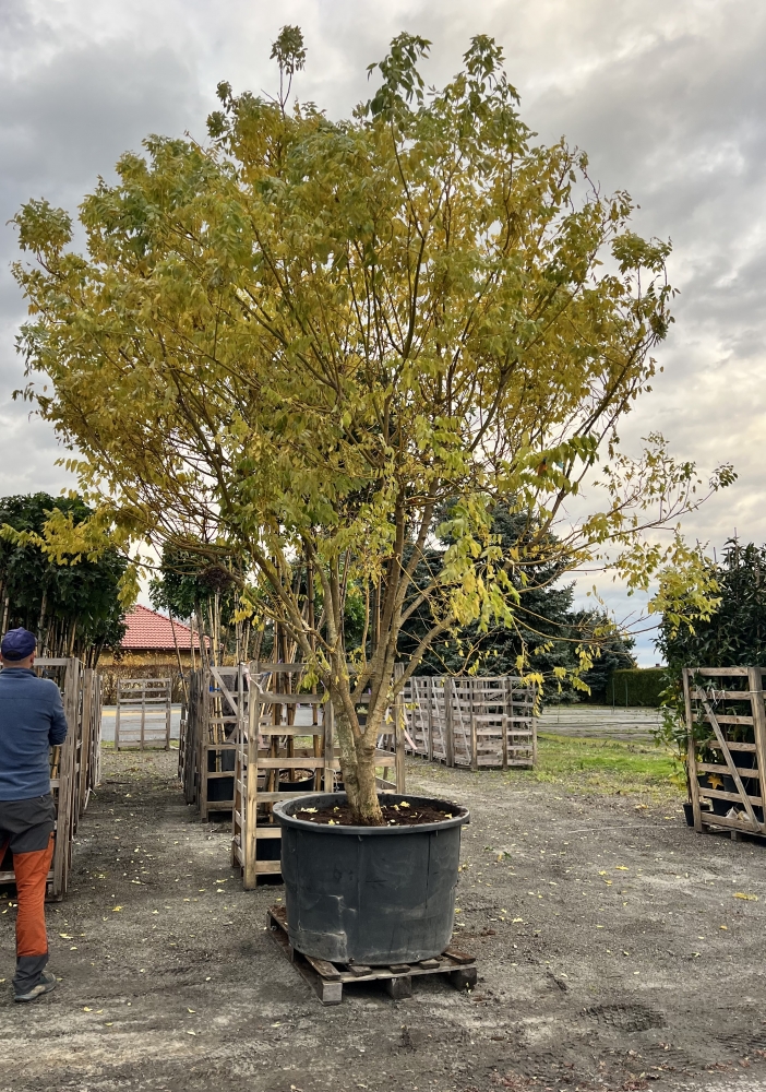 Drzewo liściaste o regularnej, kulistej koronie i złocistozielonych liściach młodych przyrostów. Jest odporny na zanieczyszczenia miejskie, dobrze znosi suszę i nadaje się do nasadzeń soliterowych oraz do miejskich alei i parków.